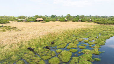 Um voo fretado leva você de Maun para o luxuoso Khwai Tented Camp na orla de Moremi Game Reserve em Botsuana. Com vista para as lagoas e lírios do Rio Khwai e projetado para minimizar o impacto no meio ambiente, este é um local ideal para começar sua autêntica experiência no mato e safári sustentável focado na comunidade. Como Khwai é uma concessão administrada pela comunidade, todos os lucros do turismo vão diretamente para ajudar a população local e projetos por meio do Khwai Community Trust.